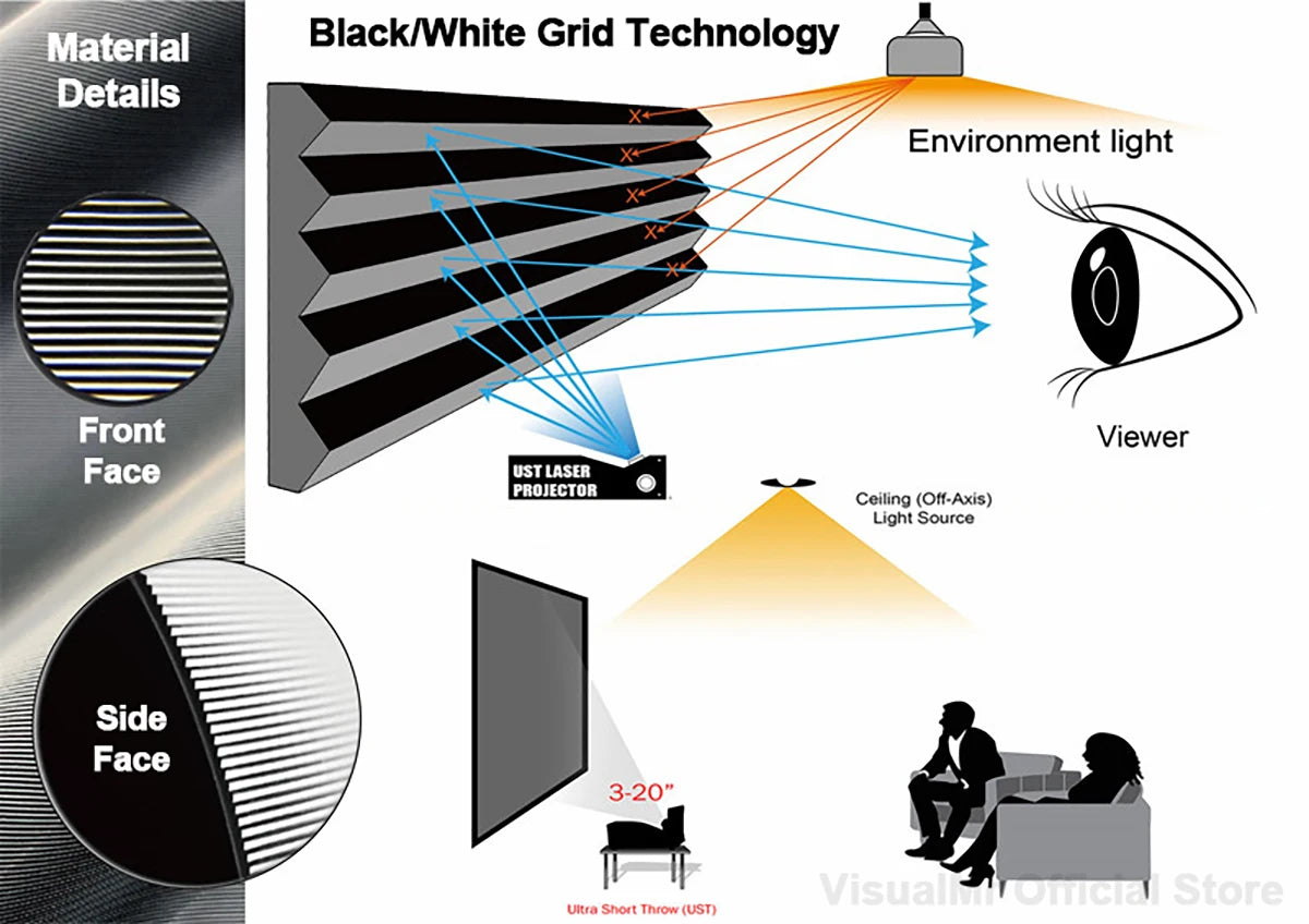 Black grid PET crystal rejects ambient light for vivid images in bright rooms.