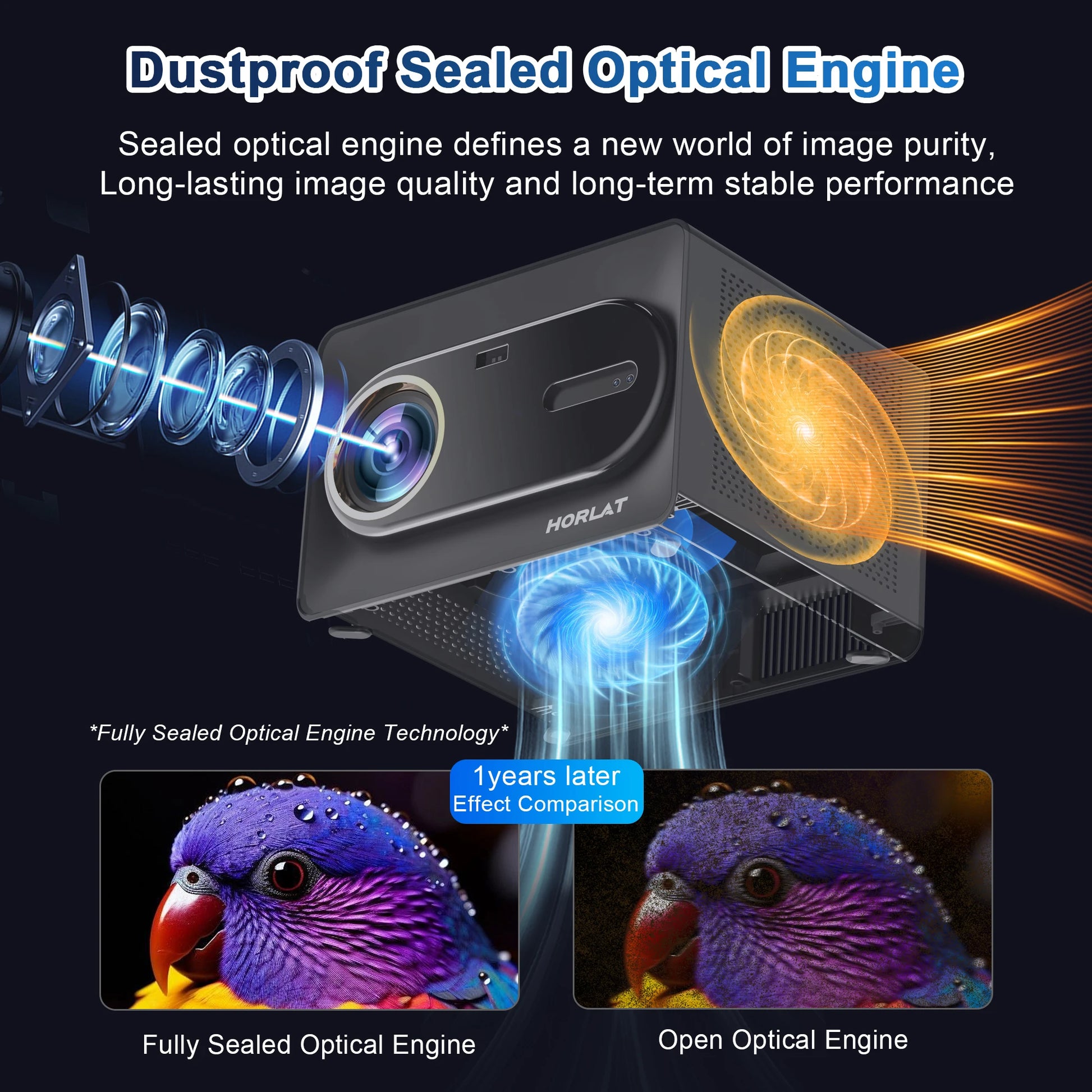 HORLAT with sealed dust-proof optics and Google TV. 3500 ANSI of brightness with voice control and auto focus.